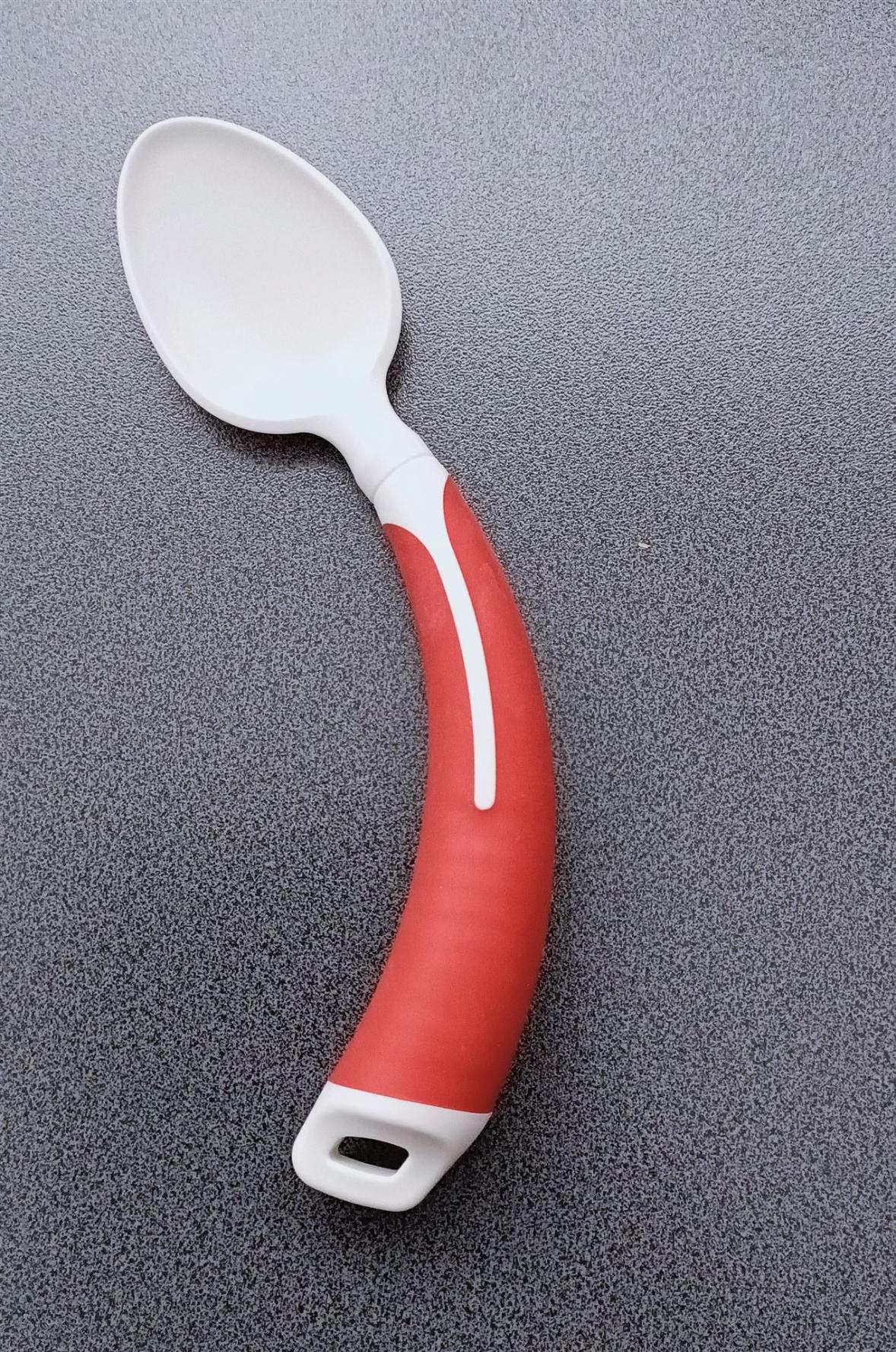 Löffel gebogen wurde von Therapeuten entworfen, für die eigenständige Nahrungsaufnahme. Der ergonomisch durchdachte, rutschfeste Griff macht es leichter, das Besteck zu halten.