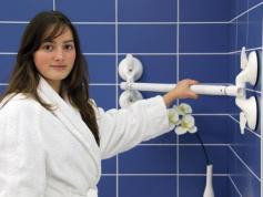 Hochlast-Variante: Der mobile Vakuum-Haltegriff QuattroPlus kann an der Wand und über Eck befestigt werden, er dient als horizontale Trainingsgreifstange und als Umsetzhilfe. Die integrierten Kreuzgelenke machen den QuattroPlus sehr flexibel und seine 4 Saugteller erhöhen die Nennlast auf bis zu 125 kg.
