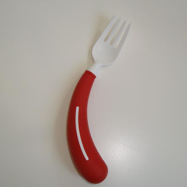 Einhänder-Besteck mit Hilfsfunktion für intuitive Benutzung. Farbem rot, silber, schwarz