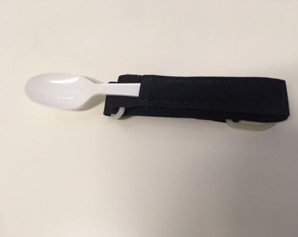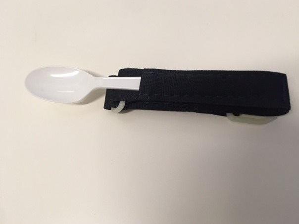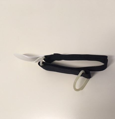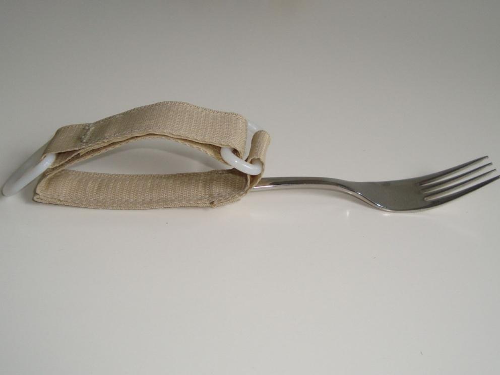 Praktischer Besteckhalter mit Schlaufe für grosse Hände. Ideal für Personen, die Schwierigkeiten beim Festhalten von Besteck haben, z.B. bei Rheuma, Arthrose oder bei Körperbehinderungen. Mit einem Klettverschluss kann die Schlaufe individuell an die Hand angepasst werden. Das Besteck wird in die eingenähte Tasche gesteckt. Durch die Spannung auf dem Gurt, der um die Hand gelegt wird, hält das Besteck sicher in dieser Tasche fest.