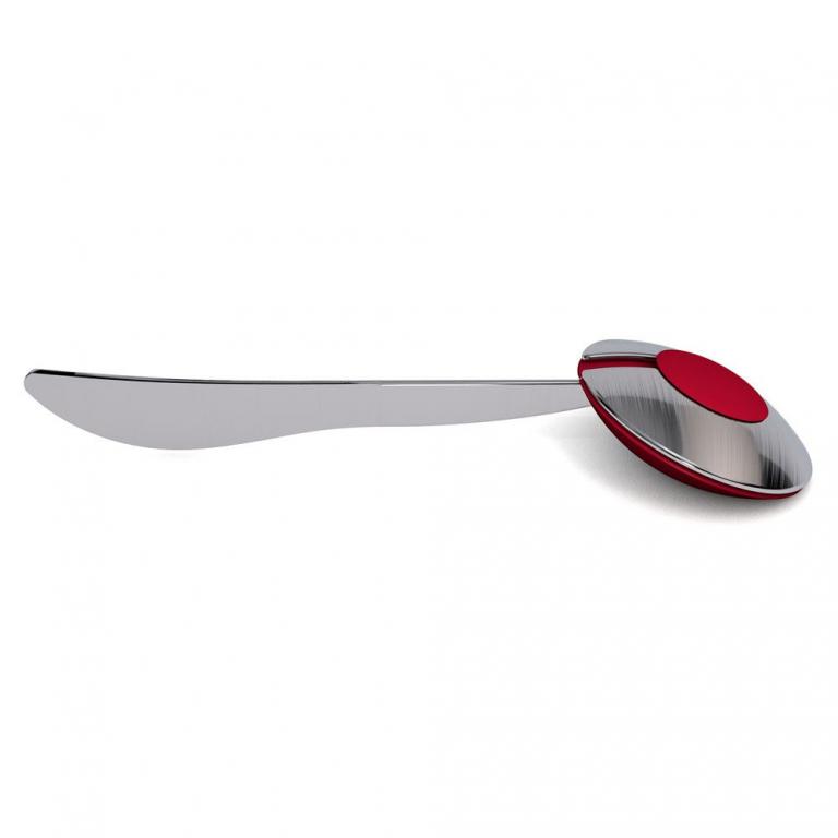 Einhänder-Besteck mit Hilfsfunktion für intuitive Benutzung. Farbem rot, silber, schwarz