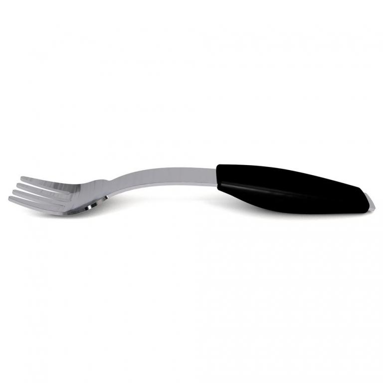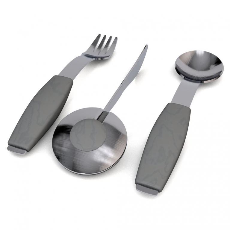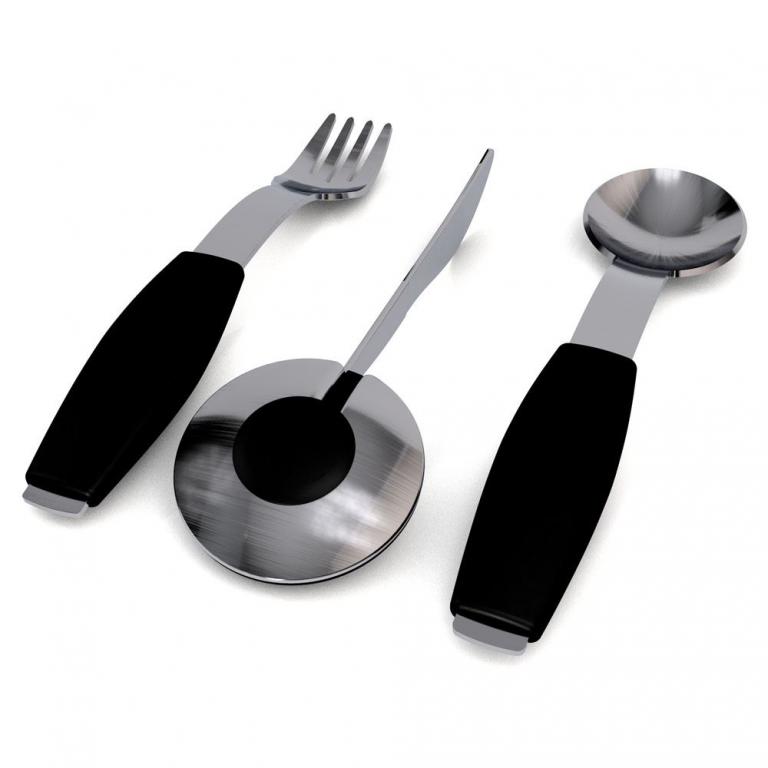 Das Besteck ist so designed, dass es optisch ansprechend und nicht stigmatisierend ist und von einer möglichst großen Nutzergruppe benutzt werden kann. Zudem verfügt es über verschiedene Features, die auch bei eingeschränkter Hand- und Fingerbeweglichkeit einen sicheren Zugriff und somit selbstständiges Essen ermöglichen: Die S-förmige Silhouette von Gabel und Löffel unterstützen in Kombination mit den ergonomisch geformten, aufschiebbaren Griffkissen beim Halten und Führen des Bestecks. Die Haptik des weichen Antirutsch-Materials TPE sorgt für einen sicheren Griff auch bei zittrigen Händen. Durch die kreisrunde Fläche des Löffels kann von allen Seiten gegessen werden, ohne dass ein besonderes abgeknicktes Besteck notwendig wird.