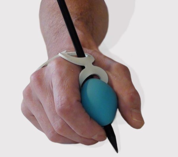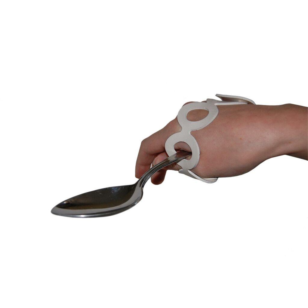 Dieser Besteckhalter ermöglicht Personen mit beeinträchtigter Greifmöglichkeit das Halten von Besteck, Haarbürsten oder Schreibinstrumenten.