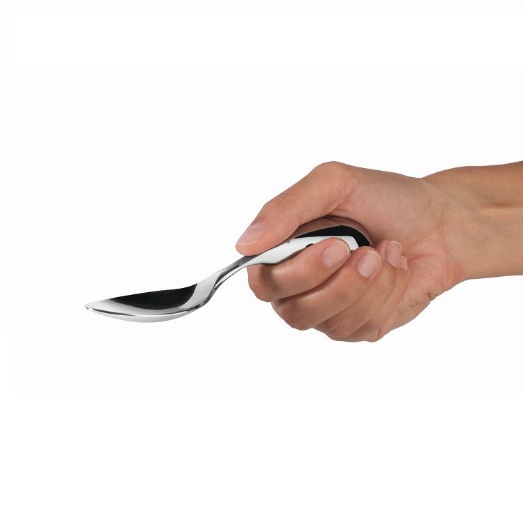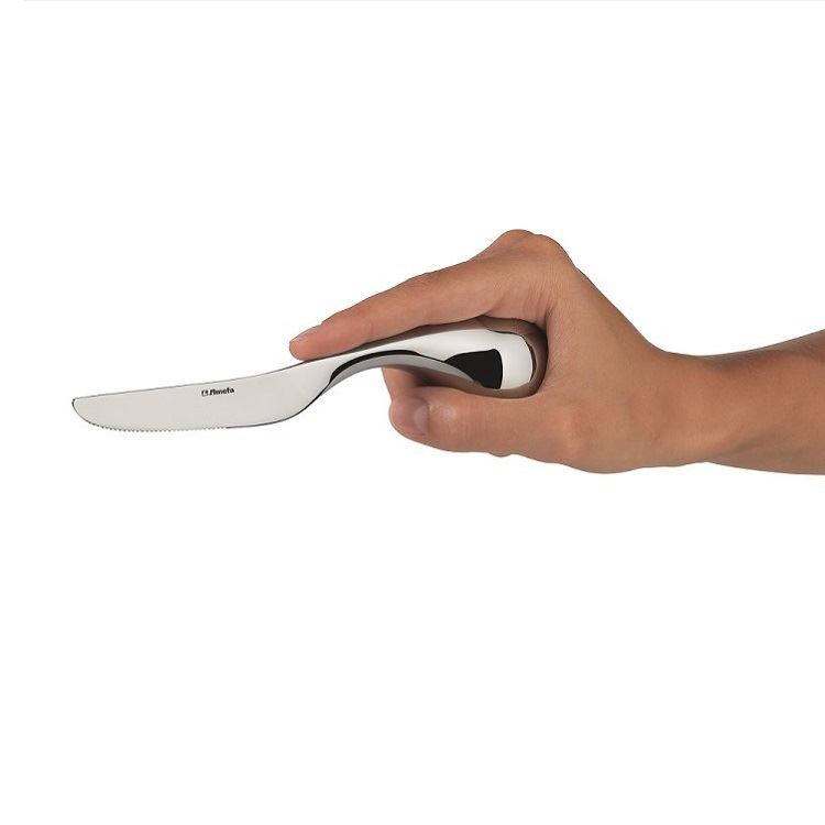 ist nicht nur innovativ, mit durchdachter Funktion und formschönem Design. Die Kugelform des Griffs passt sich perfekt den jeweiligen Bedürfnissen an. Das Messer hat eine abgeflachte Oberseite, damit ohne viel Druckausübung hantiert werden kann. Durch die Kugelform des Griffs sind verschiedene Haltepositionen möglich. Unten ist die Kugel abgeflacht, damit die Besteckteile einfach abgelegt werden kann. Hier wurde mit viel Einfühlungsvermögen ein unendbehrliches Teil für Menschen mit Bewegungseinschränkungen erdacht und komponiert.