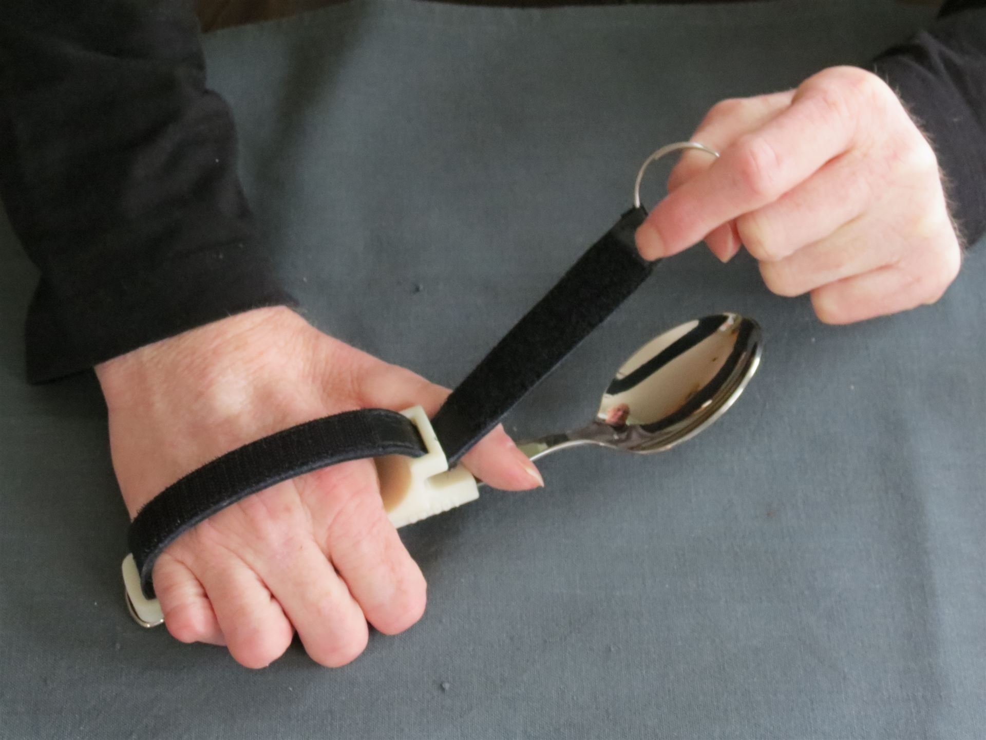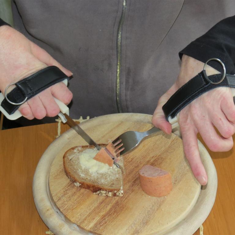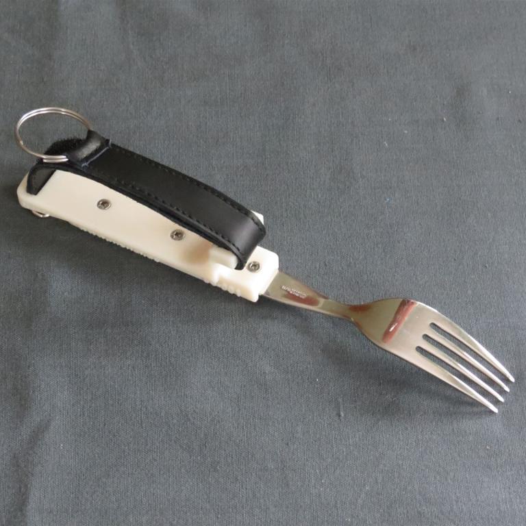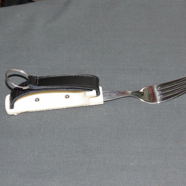 Dieser schmale Besteckhalter ist mit den Besteckteilen Gabel und Löffel kombinierbar. Durch die Befestigung mit dem Riemen an der Hand, ist dieser Halter unabhängig von der Handgröße.