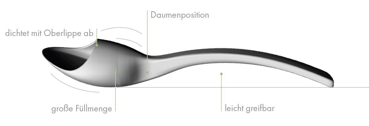 Die grossvolumige Abdeckung des Löffels sorgt für einen sicheren Transport der Flüssigkeit - auch bei Tremor oder Parkinson - zum Mund.