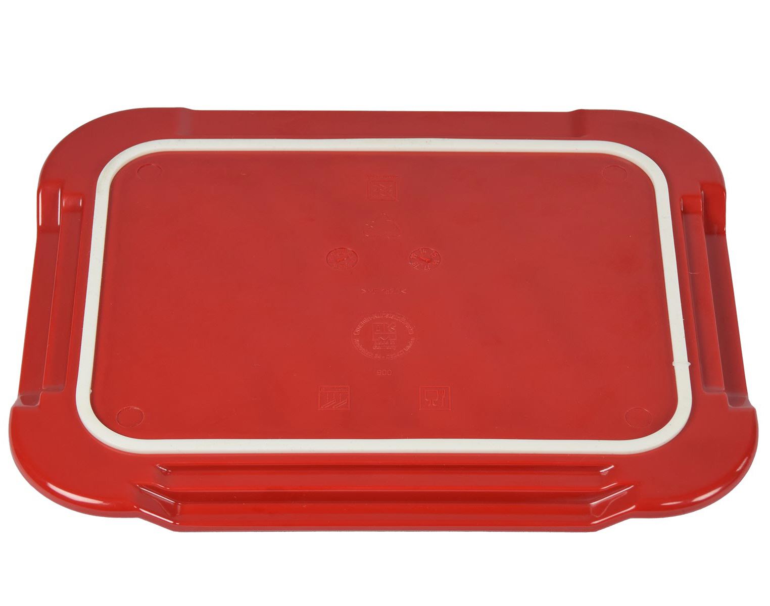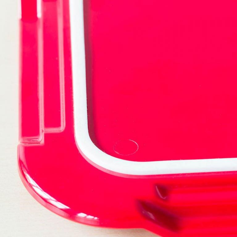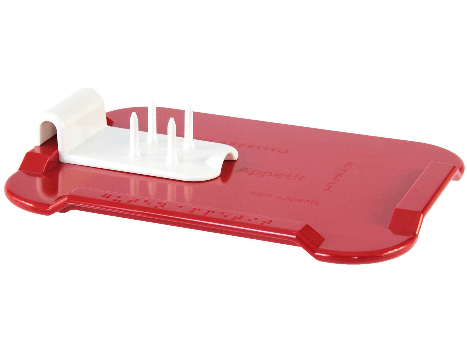 Anti-Rutsch-Ring auf der Unterseite des Brettchens inklusiv Zubereitungshilfe.Farben: rot, weiss