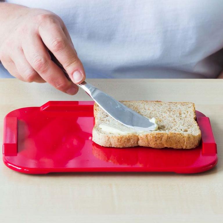 - An drei Seiten erhöhter Rand verhindert ein Verrutschen der Brotscheibe