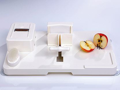 Die Küchenarbeitsstation unterstützt Menschen mit eingeschränkter Beweglichkeit der Hände, die Schwierigkeiten beim greifen haben oder einhändig sind bei der täglichen Küchenarbeit. Mit der Klemmhilfe können Lebensmittel, Schüsseln, Flaschen oder Dosen aller Art gehalten werden, so dass sie leichter zu schneiden oder zu öffnen sind. Die rostfreien Stahlspitzen halten Brot, Früchte oder Gemüse beim schneiden oder schälen fest. Eine Bürste ermöglicht auch einhändig das Waschen von Früchten und Gemüse. Eine Reibe und ein Scheibenschneider runden den Lieferumfang