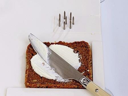entsprechend ab. Zusätzlich gibt es an einer Ecke noch einen hochgezogenen Rand, der sich hervorragend zum Schmieren von Broten eignet. Saugnäpfe auf der Unterseite verhindern ein wegrutschen der Station.