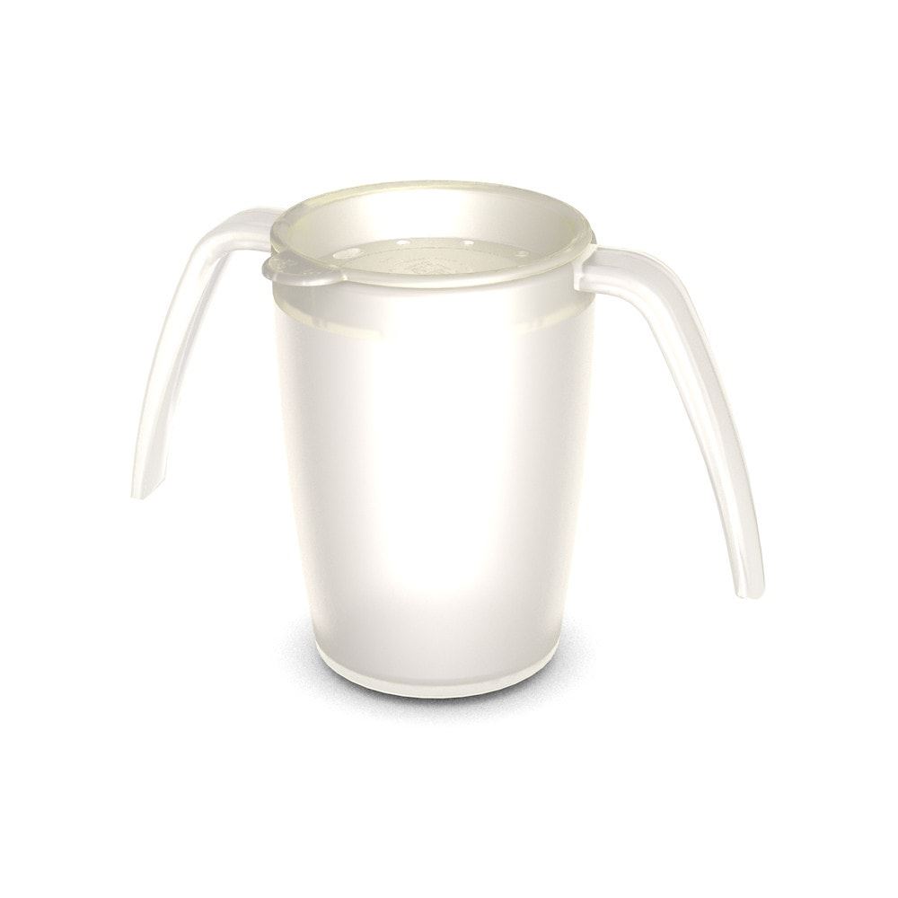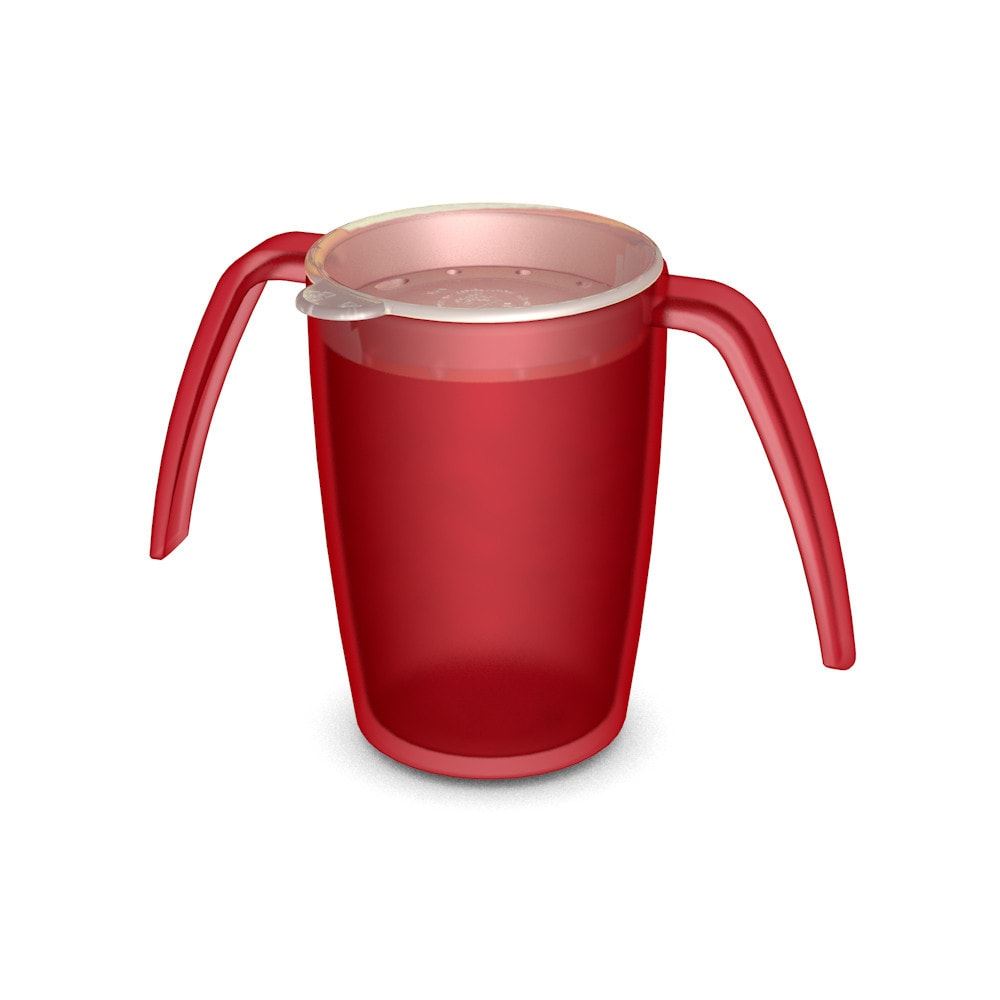 Ergonomischer 2-Henkelbecher mit Trinkdeckel.