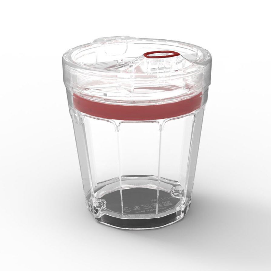 Deckel mit Trinköffnung bietet Auflagefläche für die Unterlippe (verhindert z.B. bei Halbseitenlähmung ein Auslaufen der Flüssigkeit über die Mundwinkel)