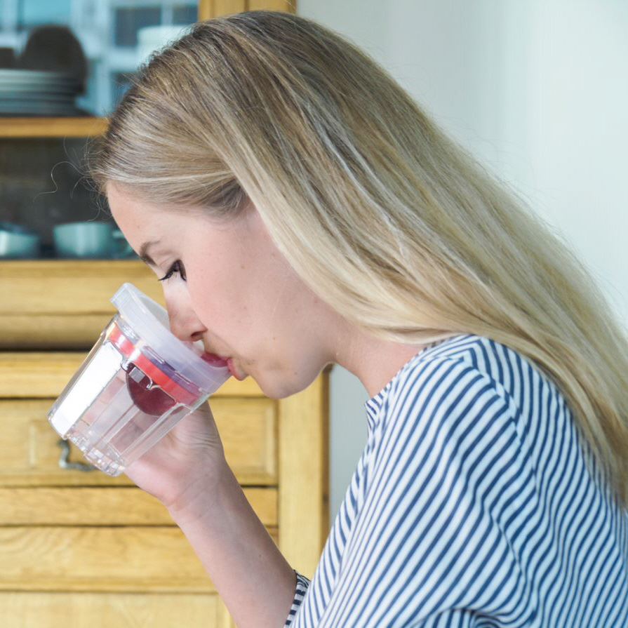 Die kleine Trinköffnung des Deckels ermöglicht dem Nutzer zudem eine perfekte Dosierbarkeit der Trinkmenge.