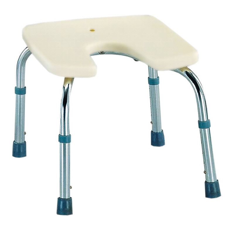 Der aus Polyethylen bestehende Sitz besitzt einen Ausschnitt für die persönliche Hygiene und Drainagelöcher für das schnellere Abfließen des Wassers. Der Rahmen besteht aus eloxiertem Aluminium. Die gewinkelten Stuhlbeine verteilen das Gewicht gleichmäßig über eine große Fläche und vergrößern so die Sicherheit des Patienten. Für extra Sicherheit und Stabilität sorgen Gummifüße mit Saugnäpfen.