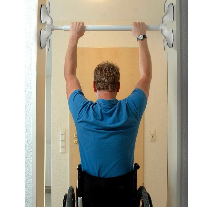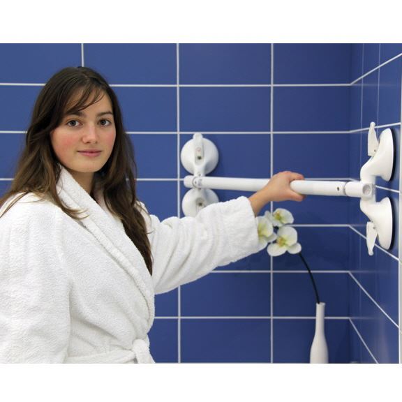 Hochlast-Variante: Der mobile Vakuum-Haltegriff QuattroPlus kann an der Wand und über Eck befestigt werden, er dient als horizontale Trainingsgreifstange und als Umsetzhilfe. Die integrierten Kreuzgelenke machen den QuattroPlus sehr flexibel und seine 4 Saugteller erhöhen die Nennlast auf bis zu 125 kg.