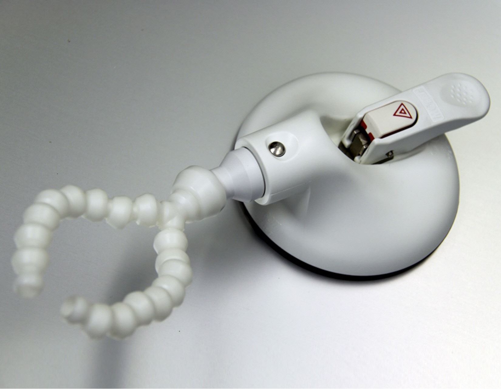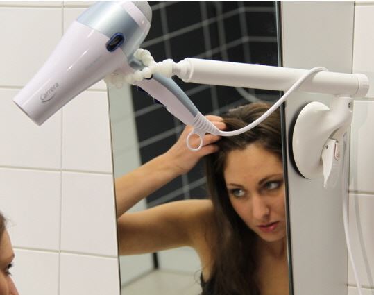 Flexibel und vielseitig. Beispielsweise lässt sich ein Föhn durch die zwei beweglichen Module fixieren. Der Zweifingerhalter dient als 3. Hand. Auch bei eingeschränkter Armtätigkeit wird es möglich, sich selbstständig zu pflegen.