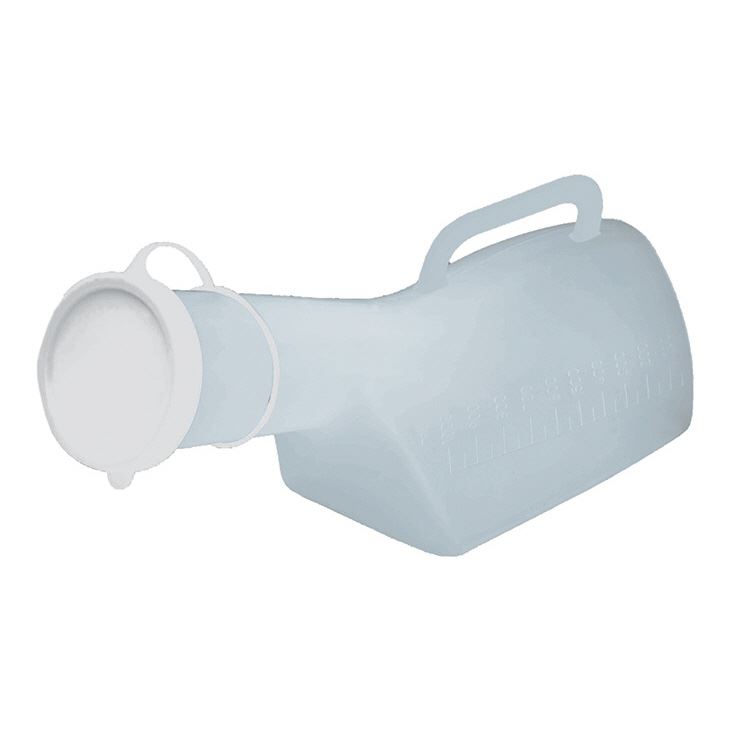Die Urinflasche besteht aus Kunststoff und hat einen Griff und einen Deckel. Die leicht transparente milchige Frabe ermöglicht die Sicht in die Flasche.