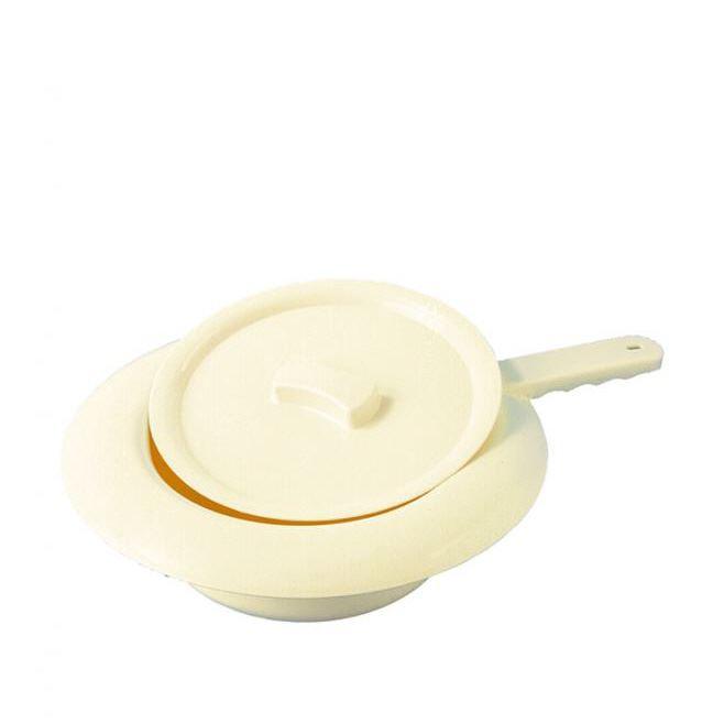 Das elfenbeinfarbene Becken aus Kunststoff hat einen Durchmesser von 31 cm, einen flachen Griff und besteht aus schlagfestem Polypropylen. Im Lieferumfang ist ein Deckel enthalten.
