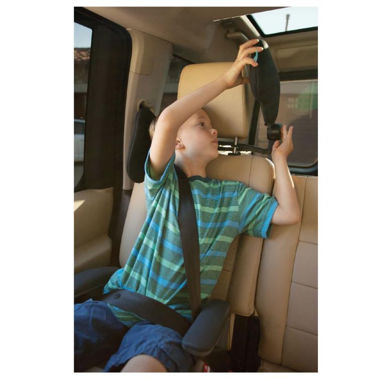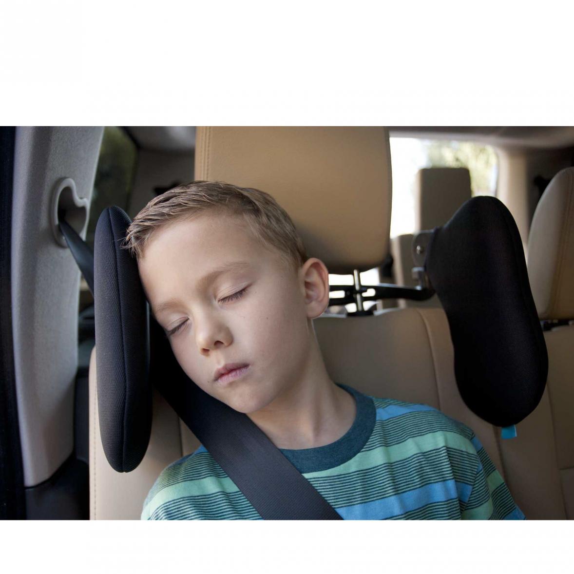 Die gepolsterte Reisekopfstütze bietet Unterstützung und Komfort für Kinder, die auf längeren Autofahrten im Wagen schlafen. Ab 12 Jahren bzw. 150 cm Körpergrösse müssen Kinder nicht mehr im Kinderautositz mitfahren, aber damit fehlt ihnen die nötige Stützung des Kopfes, falls sie doch einmal einschlafen. Eine krumme Sitzhaltung und Nackenschmerzen sind die Folge und die Kinder wachen oft quengelig wieder auf. Diese seitliche Kopfstütze wird mit der Universal-Halterung einfach an die vorhandene Auto-Kopfstütze montiert. Durch das flexible Design kann sie an verschiedene Körpergrößen angepasst werden. Wird die Kopfstütze nicht benötigt, kann sie einfach aus dem Weg geklappt werden. Die Polster sind abnehmbar und in der Maschine waschbar.