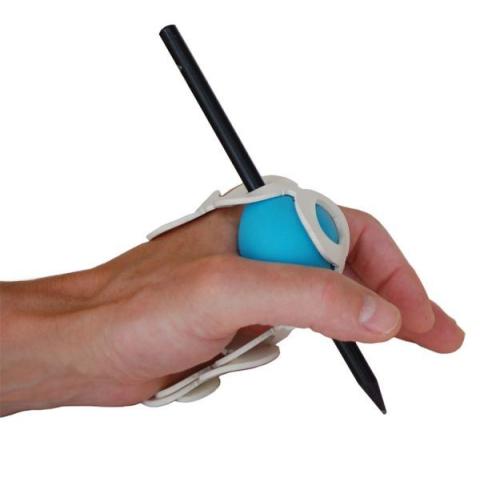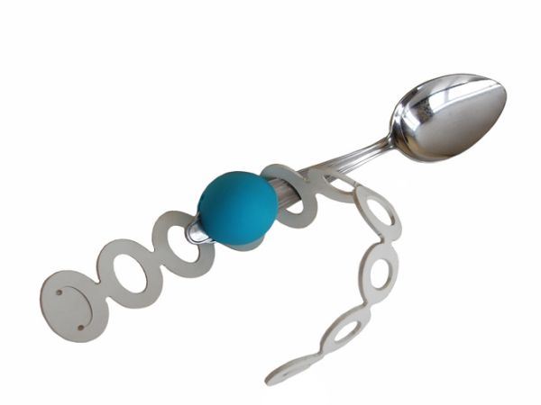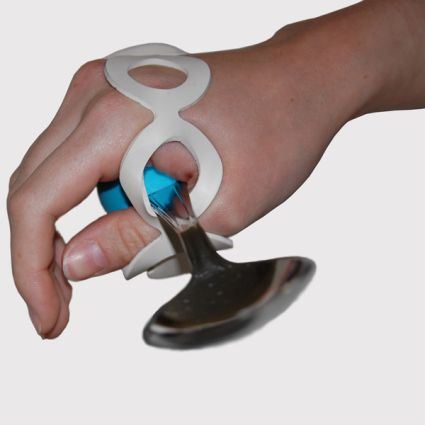 Dieser Besteckhalter ermöglicht Personen mit beeinträchtigter Greifmöglichkeit das Halten von Besteck, Haarbürsten oder Schreibinstrumenten.