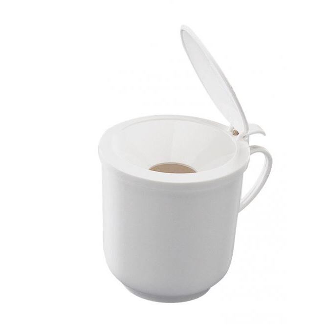Der Sputumbecher ist aus Kunststoff und hat einen Deckel. Das Fassungsvermögen beträgt etwa 400ml.