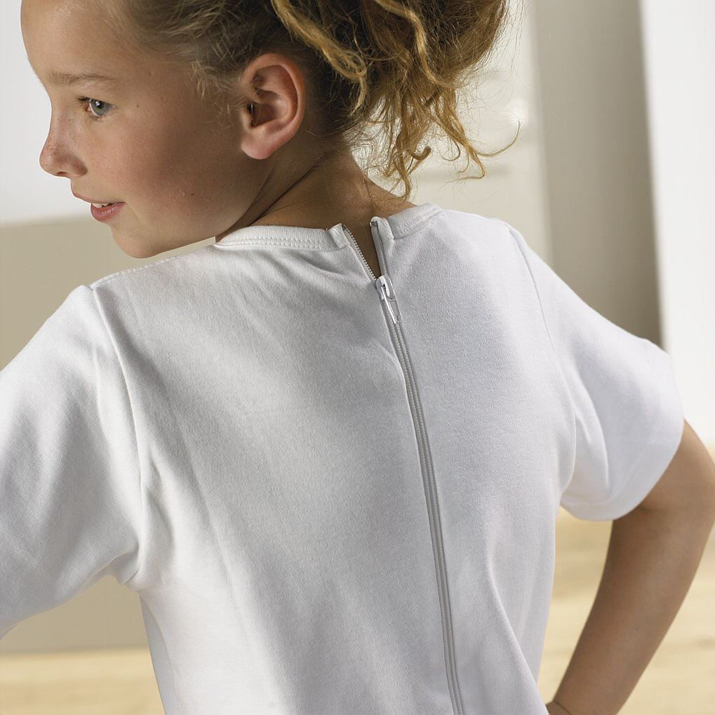 kurz Bein mit Reissverschluss im Rücken und im Schritt. Beugt dem "nackten Rücken" vor. Qualität 100% Baumwolle, 210 Gramm.