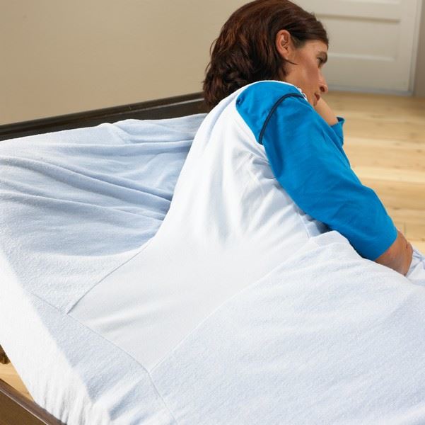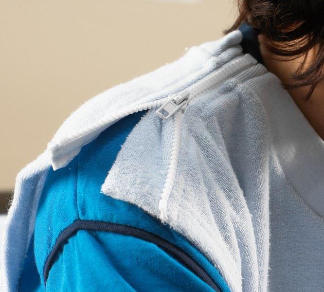 Reissverschlüsse an den Schultern erleichtern die Pflege beim Aufstehen oder zu Bett gehen. Der lange Reissverschluss vorne macht es praktisch unmöglich, die Pflegedecke selbständig zu öffnen.