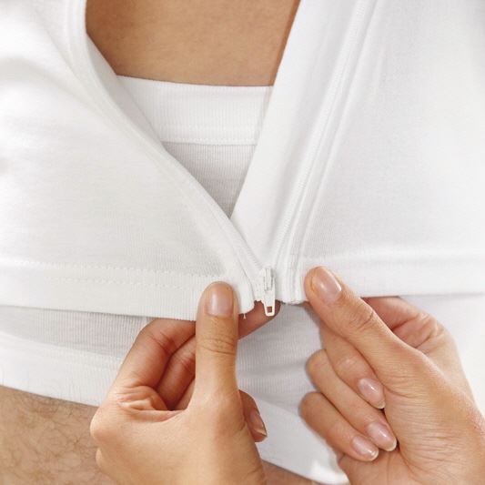 Easy Click Herren Singlet mit Druckknopfverschluss an den Schultern und einem seitlichem Reissverschluss. Geeignet für passive Personen mit sehr stark eingeschränkter Bewegungsfreiheit. Wird beim An- und Auskleiden komplett geöffnet, muss nicht über den Kopf gezogen werden.